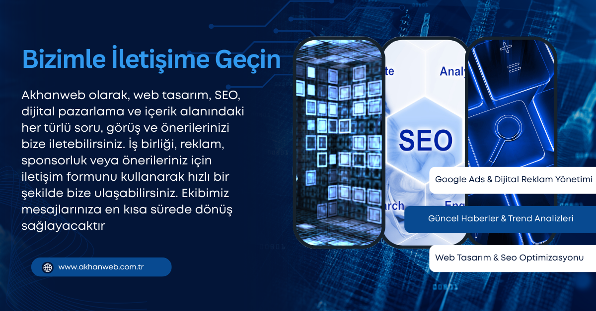Akhanweb.com.tr olarak, ziyaretçilerimizle güçlü ve güvenilir bir iletişim kurmayı önemsiyoruz. Web sitemiz, içeriklerimiz, iş birlikleri, reklam, tanıtım yazıları, web tasarım, SEO ve dijital pazarlama hizmetlerimiz hakkında her türlü soru, görüş ve öneriniz için bizimle dilediğiniz zaman iletişime geçebilirsiniz.